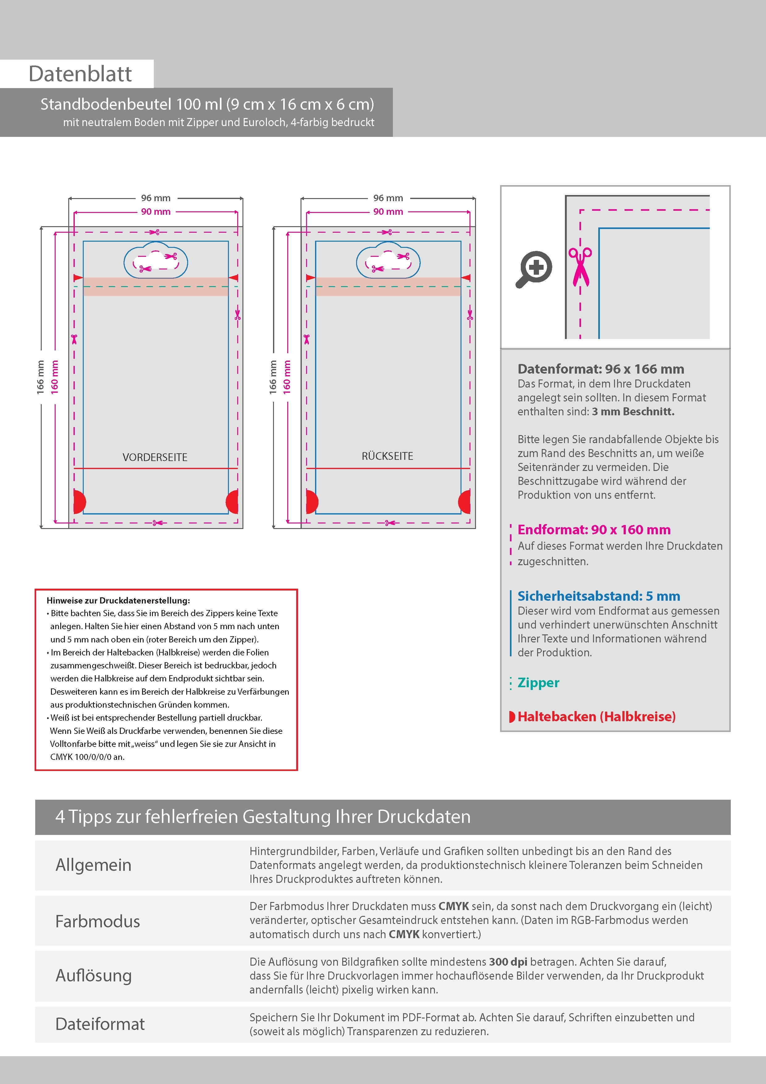 Standbodenbeutel 100 ml (9 cm x 16 cm x 6 cm) mit neutralem Boden mit Zipper und Euroloch, 4-farbig bedruckt