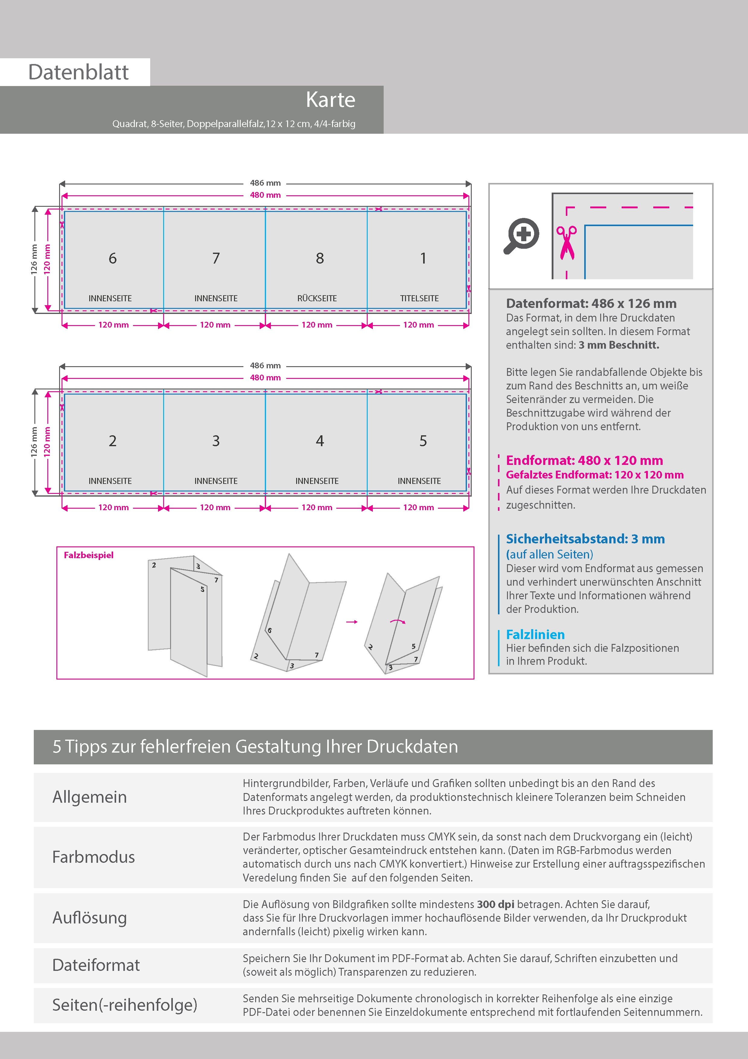 Geburtstagskarte, gefalzt auf Quadrat 12,0 cm x 12,0 cm, vertikaler Doppelparallelfalz, 8-seitig