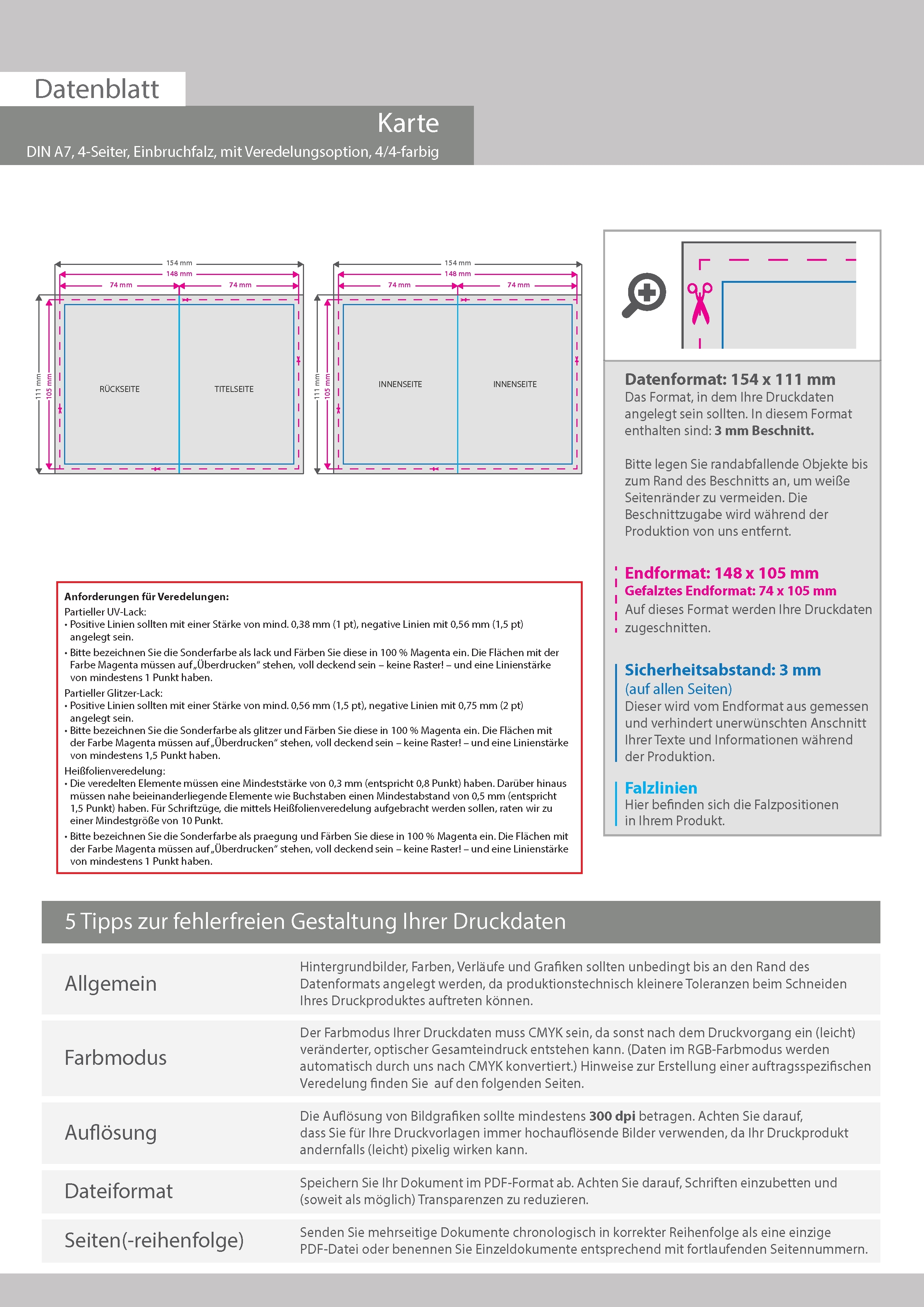 Postkarte, gefalzt auf DIN A7, 4-seitig, mit allen Veredelungskombinationen